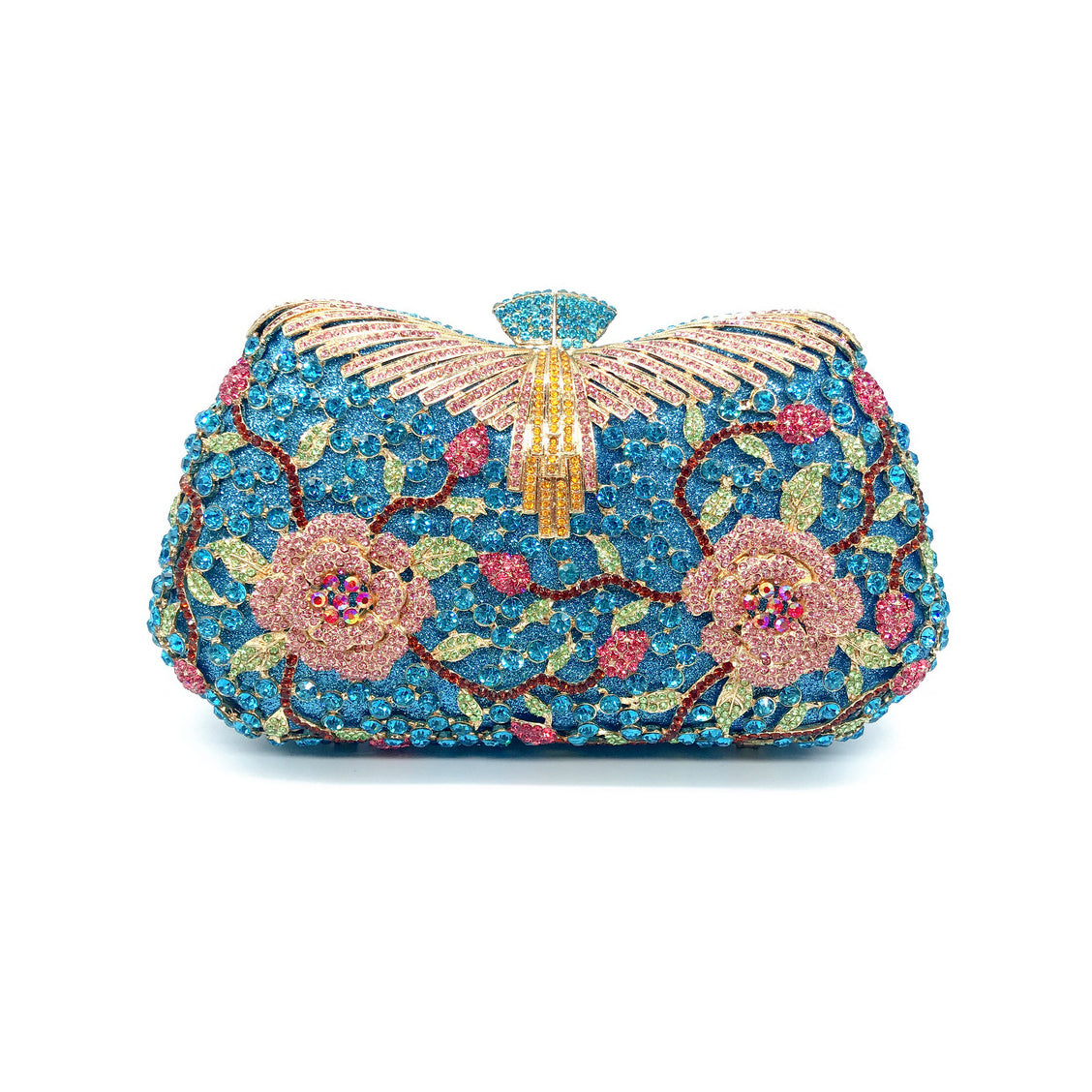 This is a dazzling evening bag adorned with rhinestones, perfect for any glamorous event. This enchanting accessory exudes a mysterious Egyptian exotic style, with a shape resembling golden wings, symbolizing eternity and divinity in ancient Egypt. The bag is decorated with floral decorations, while the artificial rhinestones on the surface emit a mysterious glow.